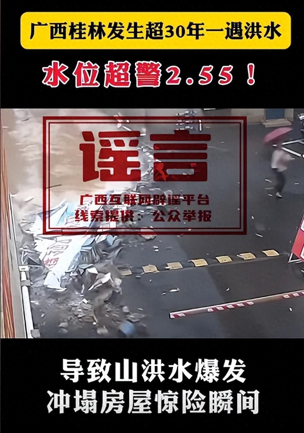 經廣西互聯網闢謠平臺覈實,該視頻通過剪輯拼接2022年7月非桂林屬地內暴雨衝倒圍牆相關視頻的方式,誤導網民認爲該片段發生於桂林,並給桂林災後生產生活秩序有序恢復造成一定負面影響。