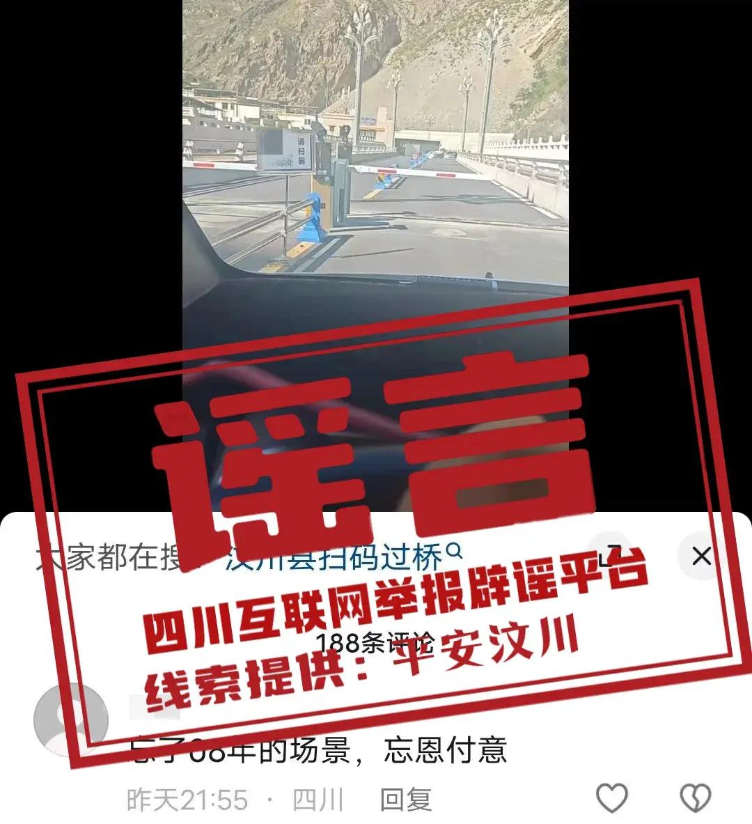 經公安機關覈查,該視頻拍攝的橋面道路系汶川一小區出入口,道閘系該小區出入口的停車費收取道閘,付款二維碼系小區停車費用繳納二維碼,且該出入口目前系封閉狀態,小區車輛主要由小區另一出入口進出。不存在視頻中所稱要收取過橋費等情況。