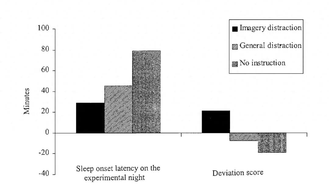 圖像分散注意力組:在睡前想象一個他們覺得有趣和吸引人、但又愉快和放鬆的場景來分散自己的注意力,但是要避免選擇一些比較刺激,容易讓大腦清醒的場景(比如一場刺激的賽車比賽)。這一組的成員大部分選擇幻想假期、夏日的午後或一些自然場景;