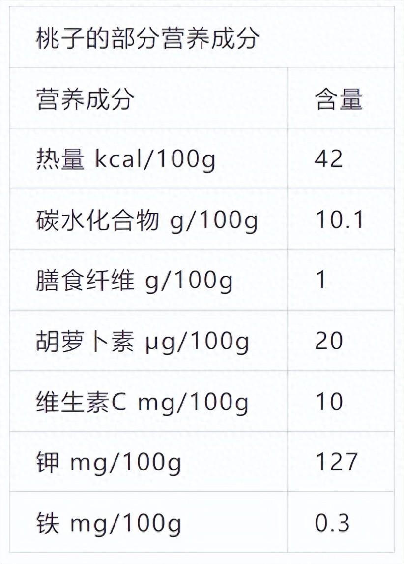 桃子的不溶性膳食纖維含量爲 1 克/100 克,這含量並不突出,連蘋果都比不上;鉀含量爲 127 毫克/100 克,在水果中算中等水平,雖說比不上香蕉,但卻是蘋果的 1.5 倍;很多人都比較關心水果中的維生素 C 含量,桃子可能會讓你失望了,它的維生素 C 含量較低,只有 10 毫克/100 克,雖說比蘋果高,但跟橙子、草莓、獼猴桃、番石榴、冬棗等水果比起來可就差遠了。