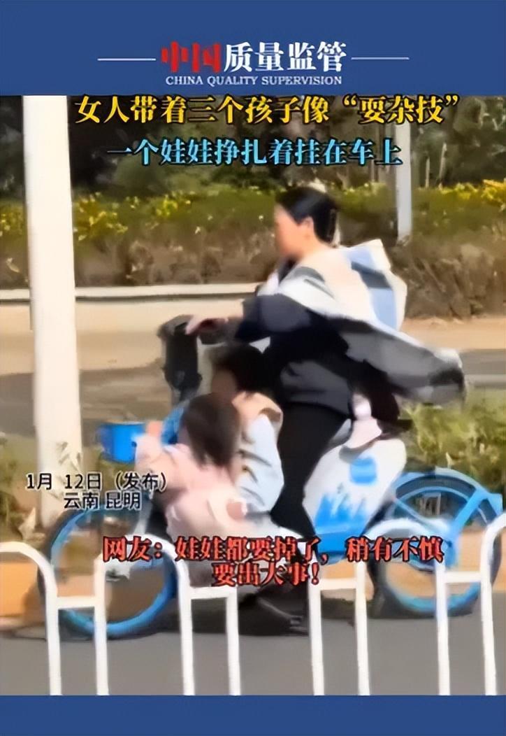 近日,網上出現一段“一女子騎車帶仨娃”的視頻,視頻畫面顯示,一女子騎共享電動車帶着三個孩子,其中一個還“掛”在車籃上,並標註發生地“廣西”,引發網民對交通安全的關注和討論。