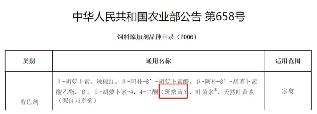 你可能會唏噓,覺得這也太沒良心了。其實,在雞飼料裏添加斑蝥黃(使蛋黃變橘紅色)是合法的,早在 2006 年《飼料添加劑品種目錄》裏,斑蝥黃就可以作爲着色劑添加到家禽的飼料中。