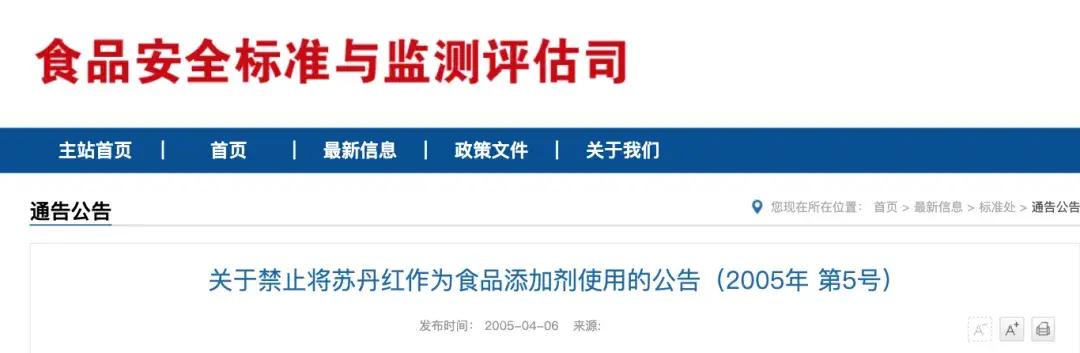 蘇丹紅是一種工業染料,由於動物實驗發現其具有致癌性,我國、歐盟等地禁止將其用於食物生產。國際癌症研究機構(IARC)把蘇丹紅認定爲三類致癌物,但不能確定它會不會讓人得癌症。2005 年衛生部曾向社會發布公告(2005 年第 5 號),不得將蘇丹紅作爲食品添加劑生產、經營和使用。