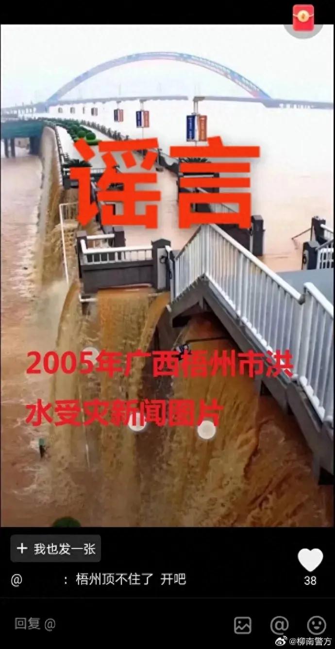 近日廣西境內多地連續持續性強降雨,多個地市城區出現路面積水、河水水位上漲等情況,廣西網民在某網絡平臺密切討論汛情動態,某網民發佈信息:一張洪水漫過梧州市河堤的圖片,並配上文字“梧州頂不住了,開吧”,隨後多人跟帖發文表示該圖片不是現在梧州汛情信息,隨後多人跟帖,多人@廣西網警。