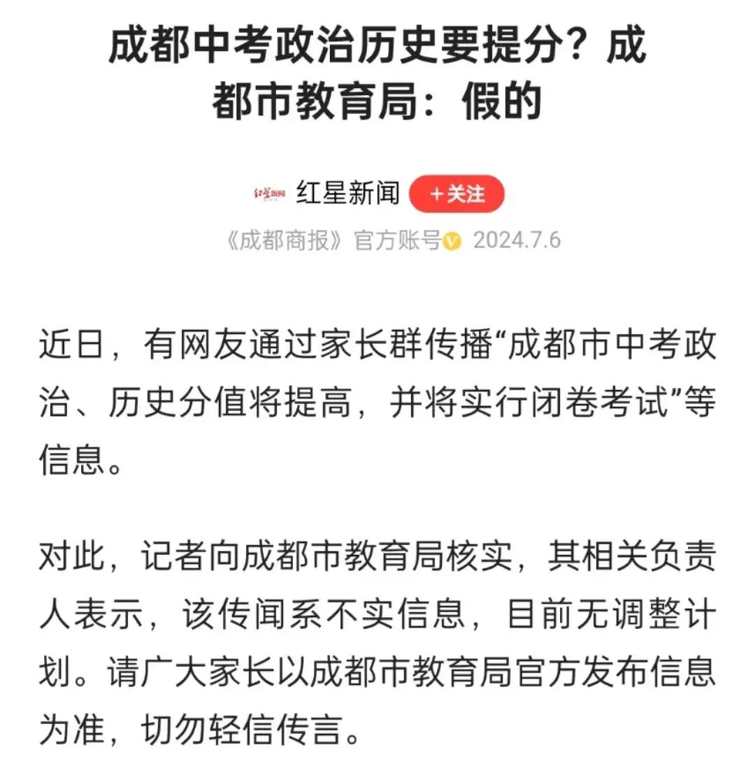 近日,有網友通過家長羣傳播“成都市中考政治、歷史分值將提高,並將實行閉卷考試”等信息,引發輿論關注。