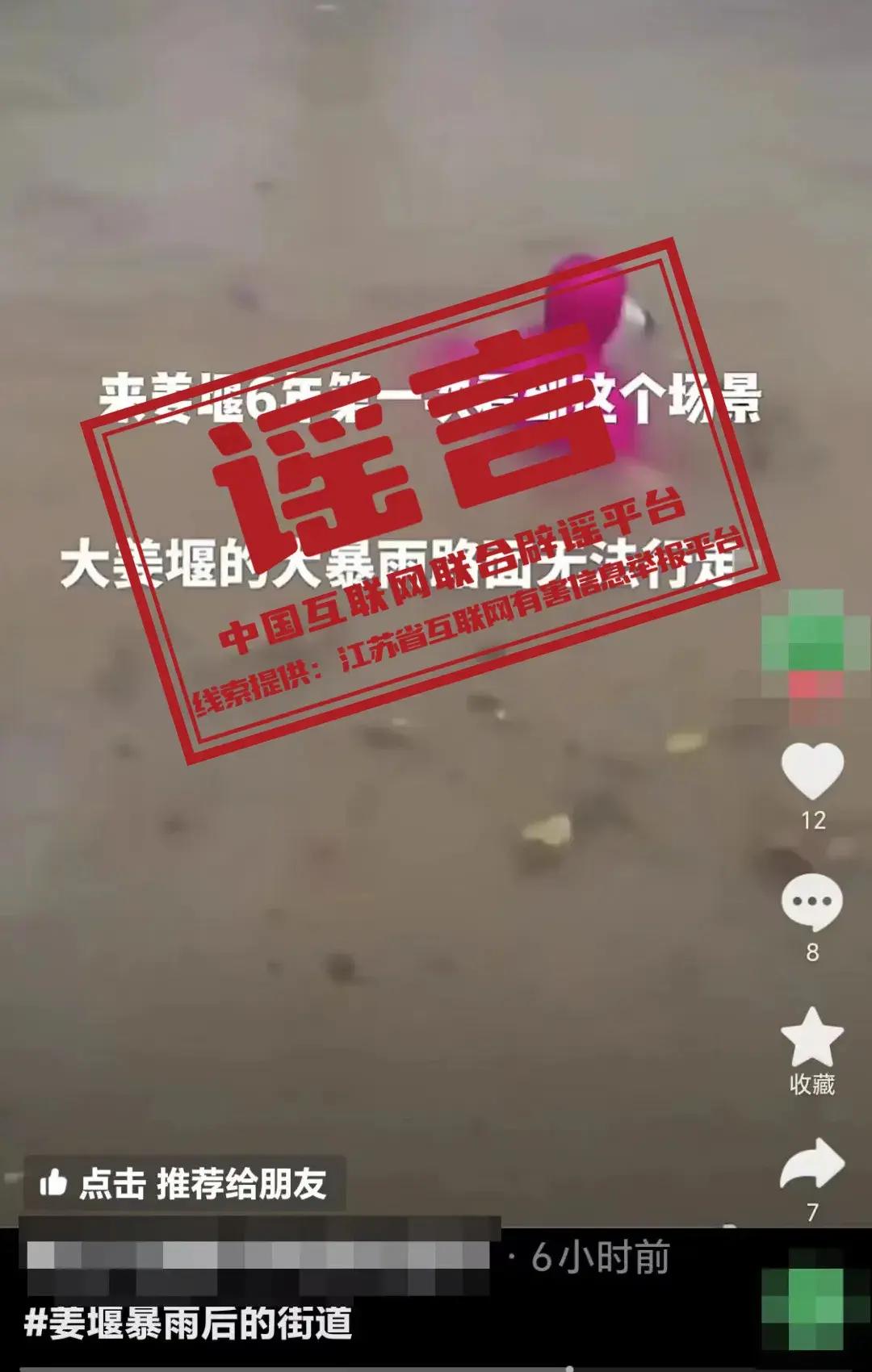 真相:近日,有網民在社交賬號上發佈暴雨視頻,並配文稱“來姜堰6年第一次看到這個場景,大姜堰的大暴雨路面無法行走”,造成不良社會影響。經江蘇省泰州市姜堰區警方查實,該視頻爲趙某爲博取眼球、吸粉增流,罔顧事實從網上下載外地洪水視頻後配文發佈。目前警方已對違法行爲人趙某依法予以行政處罰,趙某已主動將視頻刪除。(來源:江蘇省互聯網違法和有害不良信息舉報中心、“平安泰州”微信公衆號)