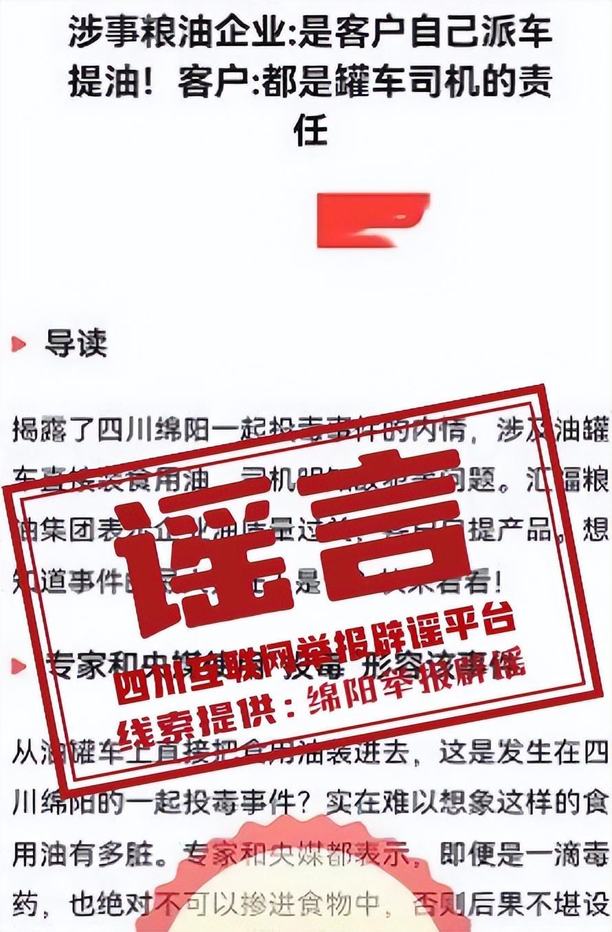 7月9日,有自媒體在一網絡平臺發佈文章,稱綿陽市發生了一起用油罐車運輸食用油的“糧油投毒”事件。經調查覈實,該帖文內容爲拼接網絡信息,與綿陽無關聯。