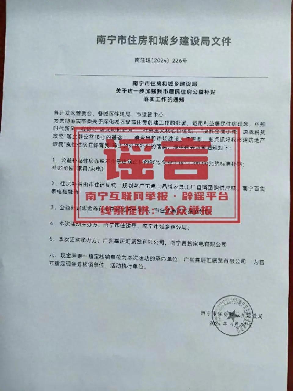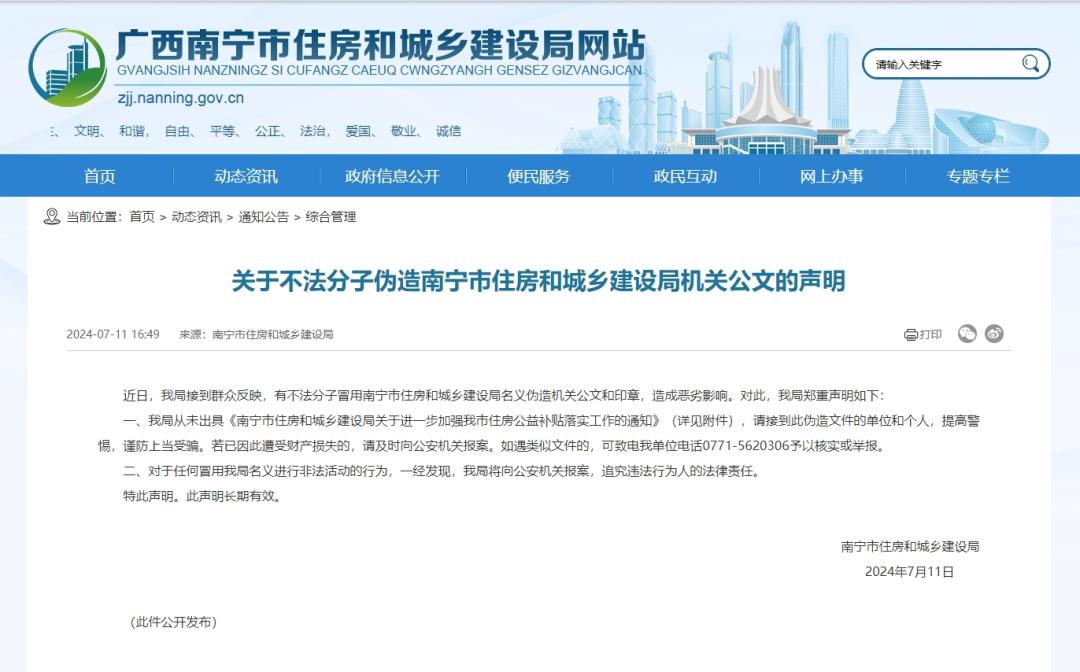 7月11日,南寧市住房和城鄉建設局發佈《關於不法分子僞造南寧市住房和城鄉建設局機關公文的聲明》,聲明中表示南寧市住房和城鄉建設局從未出具《南寧市住房和城鄉建設局關於進一步加強我市住房公益補貼落實工作的通知》。