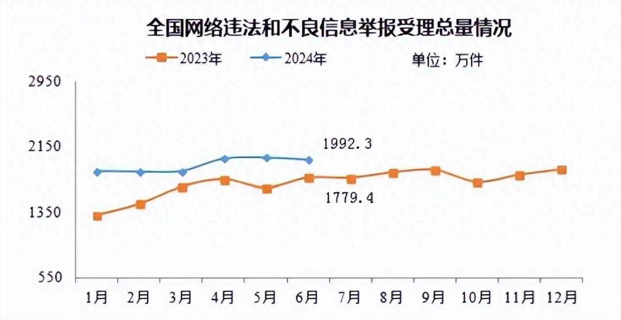2024年6月全國受理網絡違法和不良信息舉報1992.3萬件