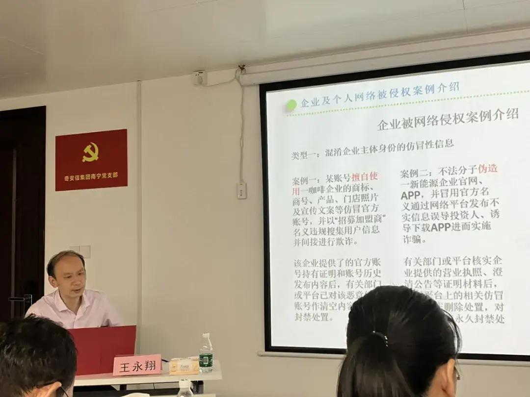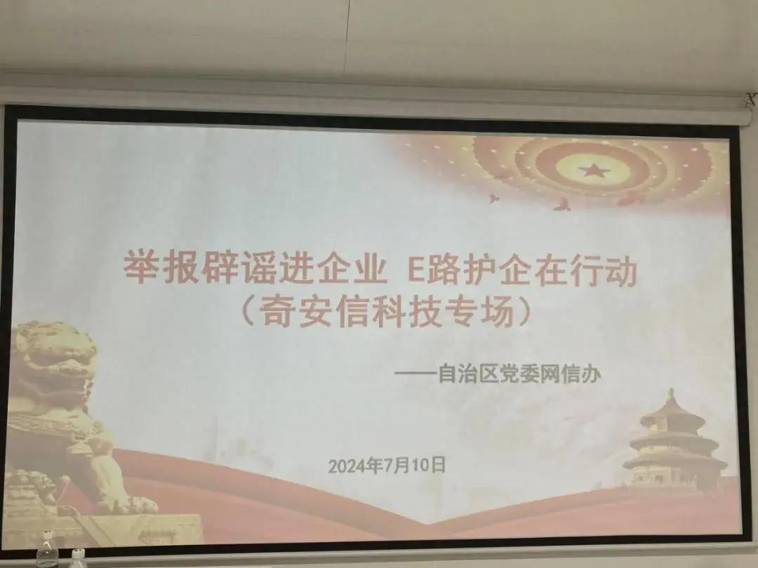 爲進一步發揮網絡舉報工作在維護企業網絡合法權益、優化營商環境中的重要作用,持續推進“e”路護企反網絡侵權品牌建設,7月10日下午,自治區黨委網信辦走進奇安信科技集團股份有限公司開展“舉報闢謠進企業 ‘e’路護企在行動”專場宣傳活動,爲該公司職工宣傳涉企侵權舉報闢謠相關知識,現場共有30餘人參加。