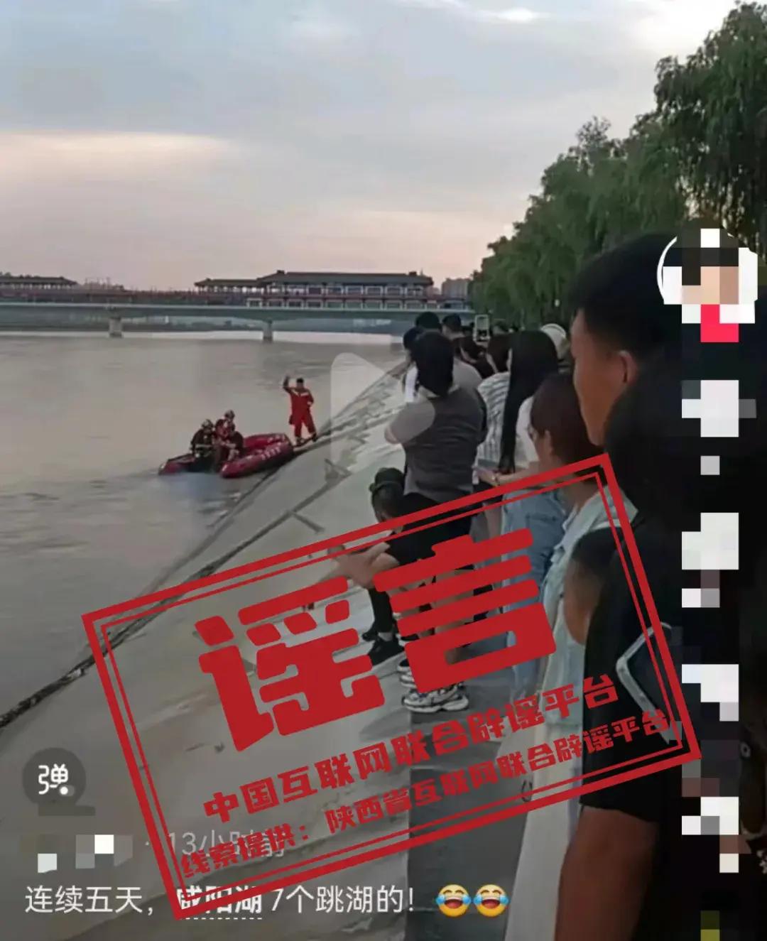 真相:近日,有網民在網絡平臺發佈短視頻稱“連續5天,咸陽湖7個跳湖的”,引發關注。經陝西省咸陽市有關部門調查,該信息爲不實信息。該視頻系網民董某爲博眼球、吸流量,在未經覈實的情況下傳播謠言,造成不良社會影響。當地公安機關依法對其進行處罰,並已責令其刪除謠言信息。(來源:陝西省網絡舉報中心)