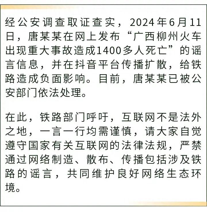 編造廣西柳州列車脫軌重大事故,唐某某受到公安部門依法處理
