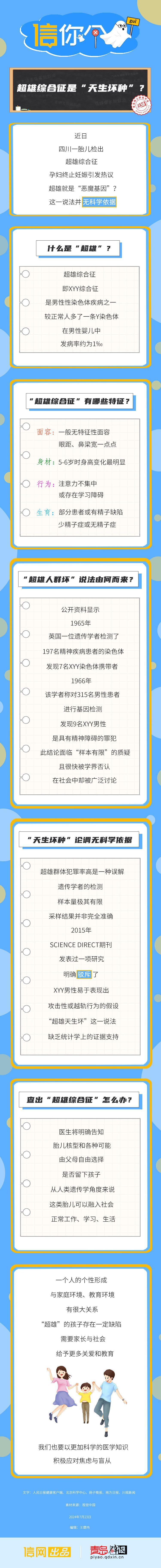 近日,四川一胎兒檢出嵌合體超雄綜合徵,引發網友關注。7月20日,家屬回應:糾結了一個月決定終止妊娠,現已在醫院,“希望不要妖魔化超雄綜合徵”。超雄綜合徵是“天生壞種”?實際上這一說法並無科學依據。