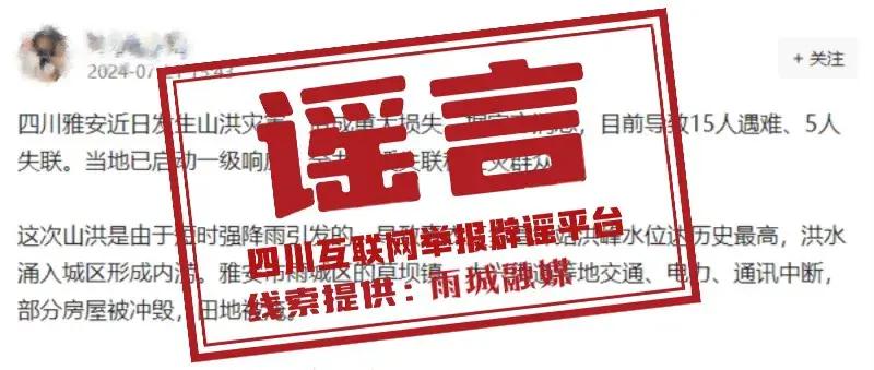 謠言:雅安雨城區草壩鎮、大興街道等地交通、電力、通訊中斷,部分房屋被沖毀,田地被淹,山洪致多人失聯?