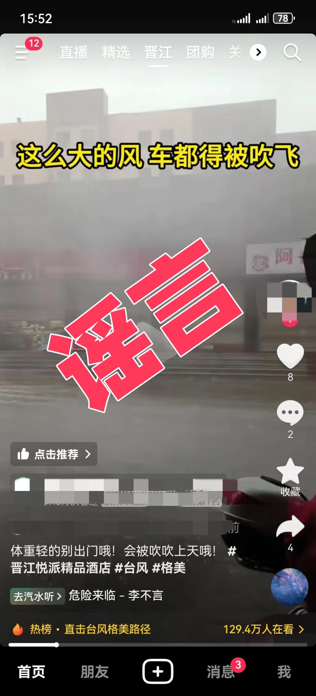 經覈查,該視頻爲2023年臺風杜蘇芮期間發生的視頻,發佈該視頻的網民許某華(男,40歲,三明人,現居晉江)爲吸引流量便隨意發佈不實視頻。公安機關依法對許某華進行批評教育。