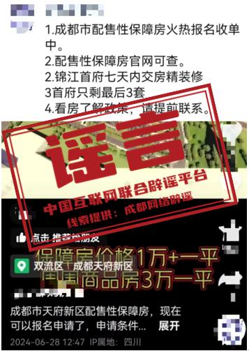 詳情:近日,有網傳消息稱“成都市配售保障、經濟適用住房”,引發網民關注。經成都市住房和城鄉建設局調查,該消息系謠言,成都市配售型保障性住房目前尚處於政策研究起草階段,無配售型保障性住房、經濟適用房在售。公安機關已依法對相關賬號責任主體進行行政處罰。(來源:“成都網絡闢謠”微信公衆號)
