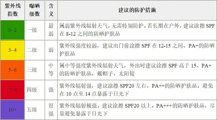 我們國家就制定過不同紫外線指數及相應的防護建議,見下表。