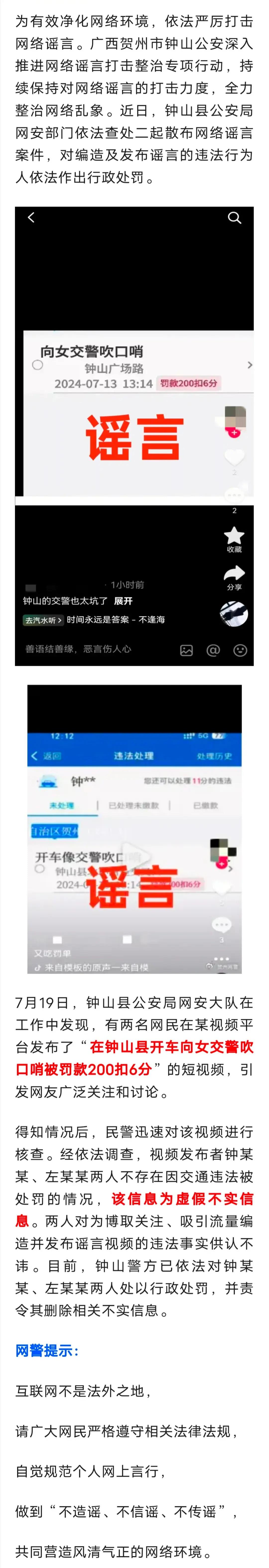 在廣西賀州鐘山縣開車向女交警吹口哨被罰?兩名網民造謠被處罰!