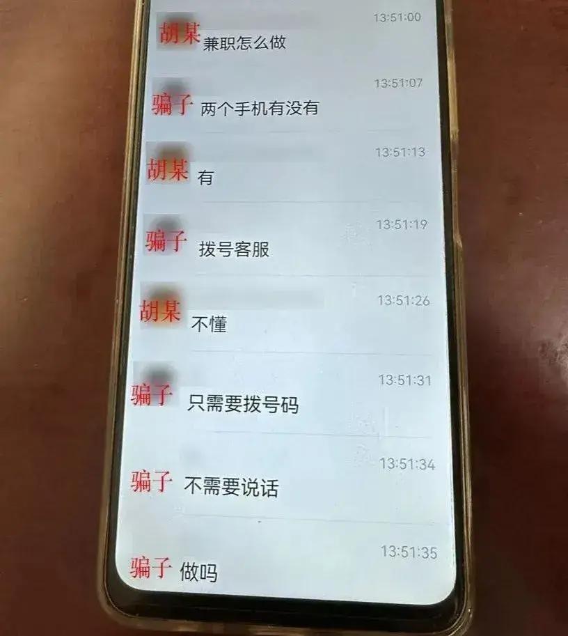 6月下旬,胡某在朋友圈看到一則兼職消息。只要擁有兩部手機就能一個小時賺300元,工資日結。這麼簡單又來錢快的工作,胡某心動了,主動聯繫了對方。