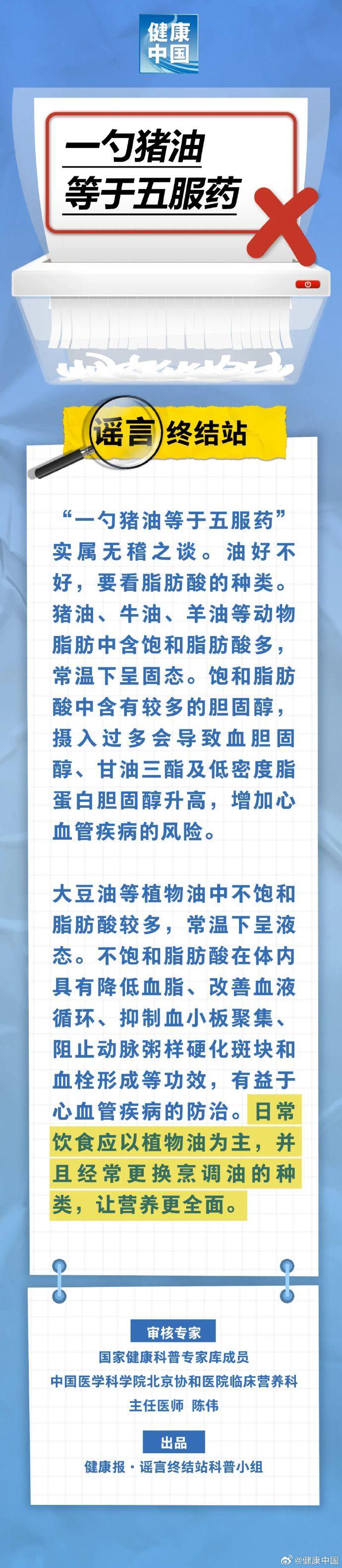 一勺豬油等於五服藥?實屬無稽之談。油好不好,要看脂肪酸的種類。豬油、牛油、羊油等動物脂肪中含飽和脂肪酸多,常溫下呈固態。飽和脂肪酸中含有較多的膽固醇,攝入過多會導致血膽固醇、甘油三酯及低密度脂蛋白膽固醇升高,增加心血管疾病的風險。
