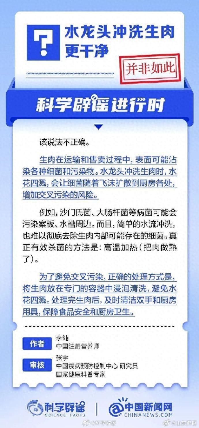 水龍頭沖洗生肉更乾淨?水龍頭沖洗生肉反而容易造成交叉污染。生肉在運輸和售賣過程中,表面可能沾染各種細菌和污染物。水龍頭沖洗生肉時,水花四濺,會讓細菌隨着飛沫擴散到廚房各處,增加交叉污染的風險。正確的處理方式是,將生肉放在專門的容器中浸泡清洗,避免水花四濺。處理完生肉後,及時清潔雙手和廚房用具,保障食品安全和廚房衛生。