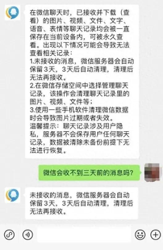 但出現3種情況可能會導致無法查看相關記錄,其中一種是:未接收的消息,微信服務器會自動保留3天,3天后自動清理,清理後無法再接收。