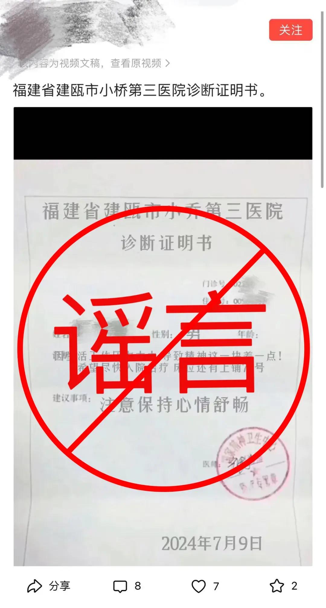 今年7月,葉某在網絡上發佈信息曬出一張自己精神疾病證明,標題稱“福建省建甌市小橋第三醫院診斷證明書。”經公安機關覈查,該信息所描述事件爲葉某虛構編造,葉某爲博取關注、吸引流量,將“建甌市小橋第三醫院診斷證明書” P上自己的名字發佈在某平臺。目前,公安機關已依法對葉某予以行政處罰。