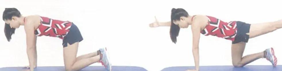 四點支撐位(雙手/雙腿與肩同寬,上肢及大腿垂直於地面),令雙側膝關節輕微抬起保持核心收緊及骨盆穩定,完成上肢/下肢抬起向遠端運動或對側/同側上下肢同時抬起向遠端運動。進階可於膝關節輕微抬起位完成。