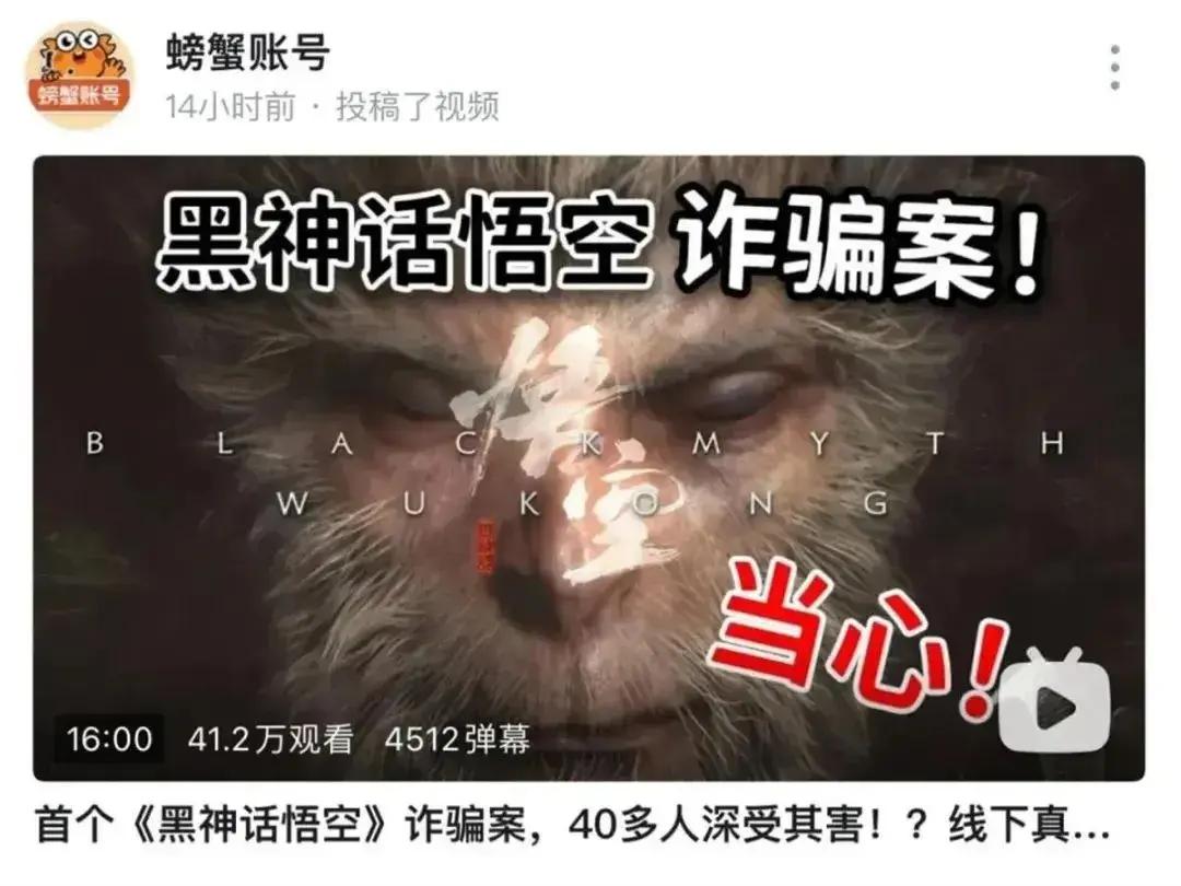 武漢市反電信網絡詐騙中心介紹,當天,B站UP主“螃蟹賬號”發佈視頻,稱收到多位受害者投稿,在某二手平臺購買的《黑神話:悟空》遭到賣家詐騙。