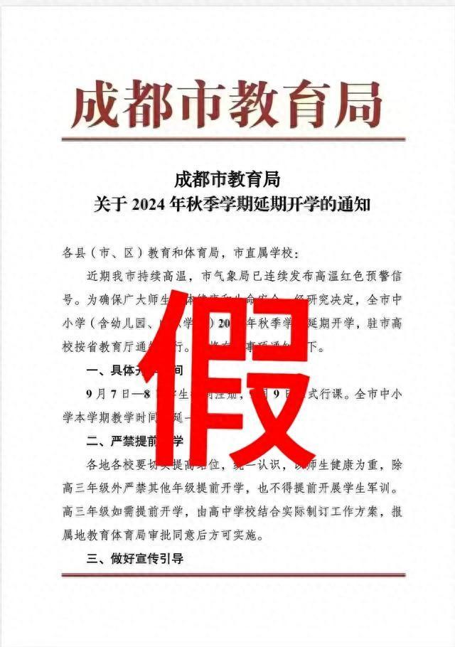 8月29日,一張關於2024年秋季學期延期開學的紅頭文件截圖,在網上流傳。記者向成都市教育局求證覈實後得知,這張截圖中的內容爲假消息,並非成都市教育局官方發佈。