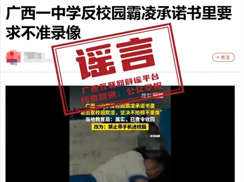 經廣西互聯網闢謠平臺覈實,該視頻不實,網傳承諾書實際爲外省某中學出具的反對校園欺凌承諾書,並非發生在廣西。