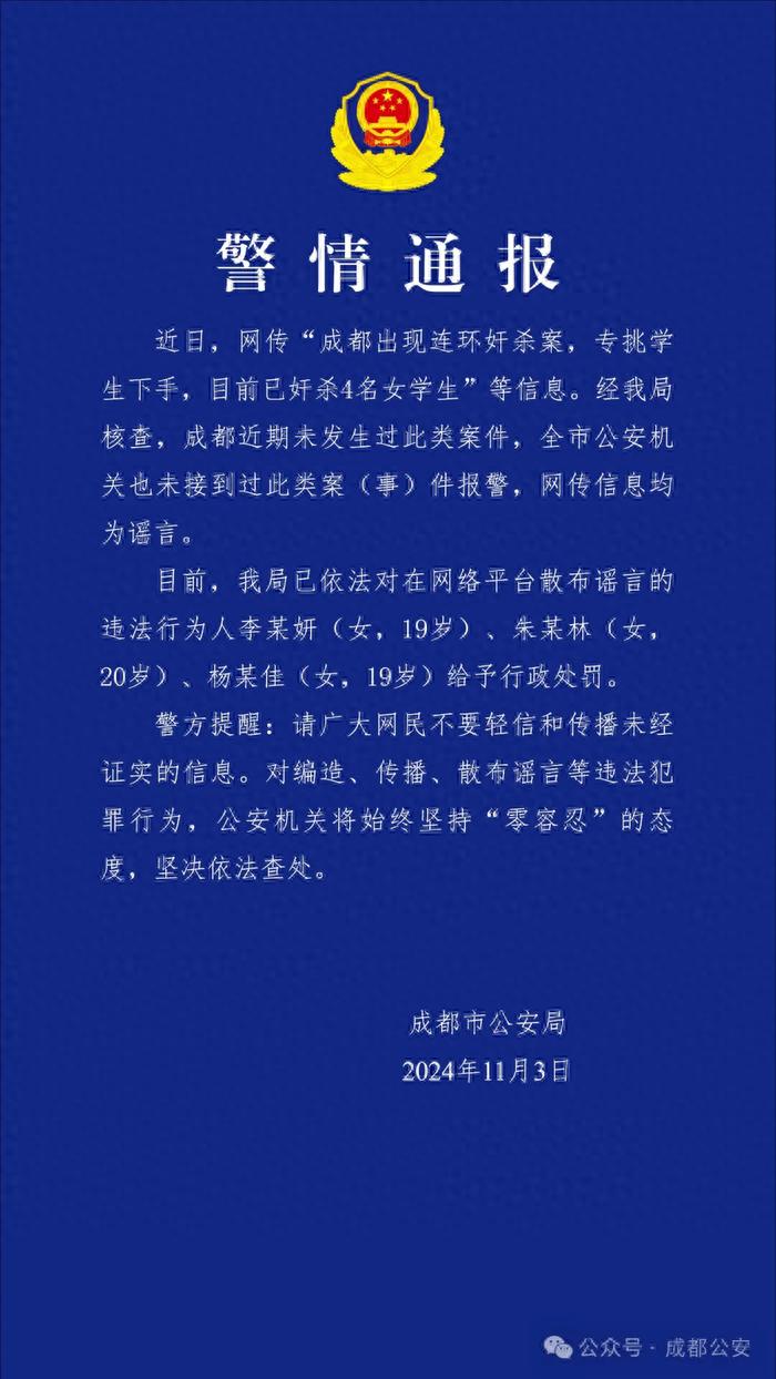 成都公安11月3日通報,近日,網傳“成都出現連環姦殺案,專挑學生下手,目前已姦殺4名女學生”等信息。經警方覈查,成都近期未發生過此類案件,全市公安機關也未接到過此類案(事)件報警,網傳信息均爲謠言。目前,成都公安局已依法對在網絡平臺散佈謠言的違法行爲人李某妍(女,19歲)、朱某林(女,20歲)、楊某佳(女,19歲)給予行政處罰。