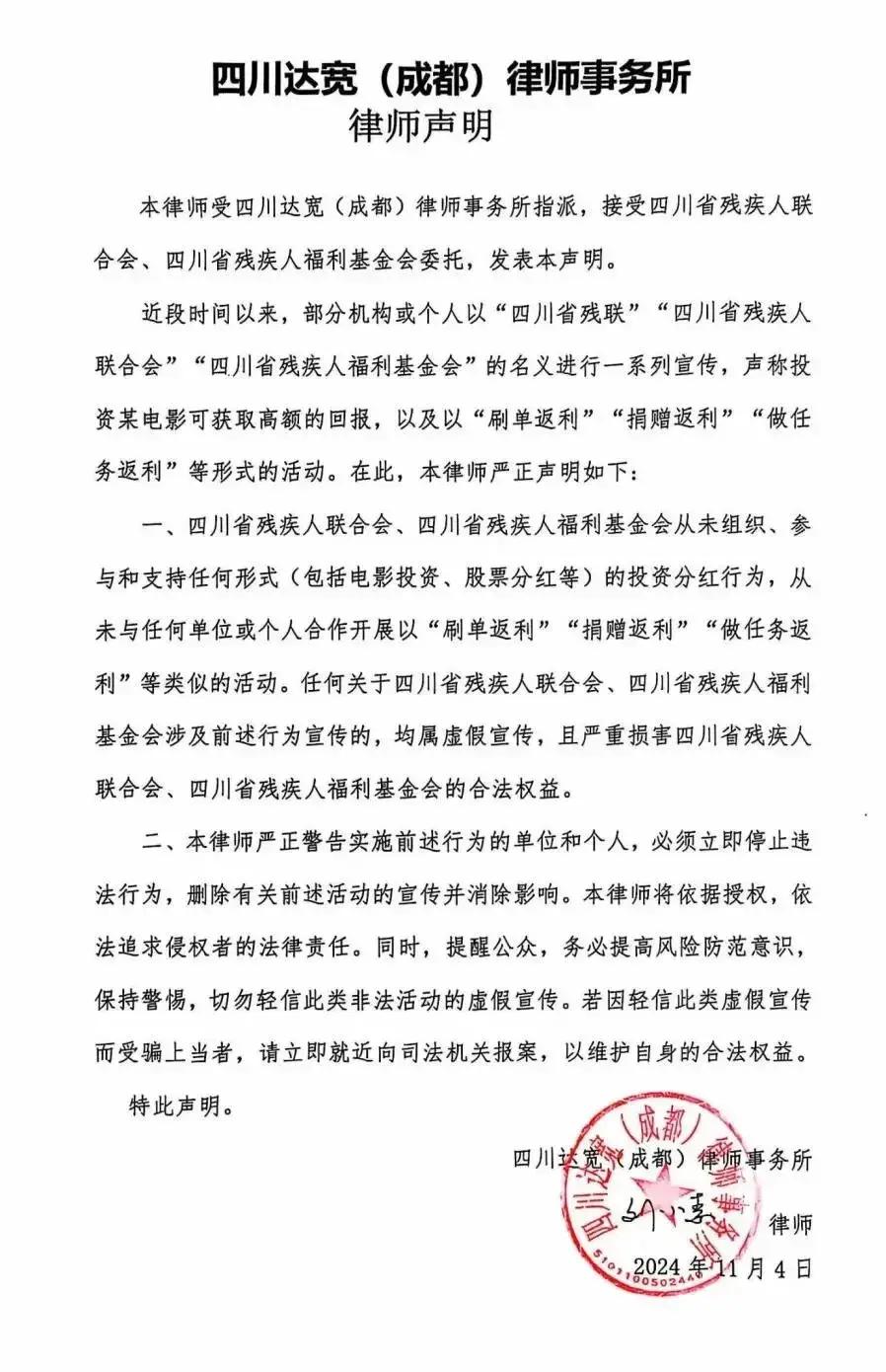 對此,四川省殘聯11月4日發佈聲明稱:四川省殘疾人聯合會、四川省殘疾人福利基金會從未組織、參與和支持任何形式(包括電影投資、股票分紅等)的投資分紅行爲,從未與任何單位或個人合作開展以“刷單返利”“捐贈返利”“做任務返利”等類似的活動。任何關於四川省殘疾人聯合會、四川省殘疾人福利基金會涉及前述行爲宣傳的,均屬虛假宣傳。(來源:四川殘聯)
