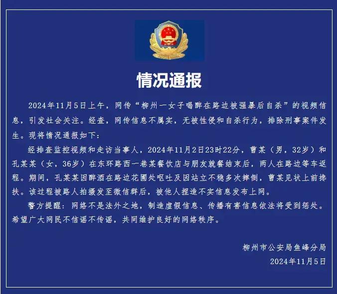 11月5日,柳州市公安局魚峯分局針對網傳視頻發佈情況通報表示,經排查監控視頻和走訪當事人,2024年11月2日23時22分,曹某(男,32歲)和孔某某(女,36歲)在東環路西一巷某餐飲店與朋友就餐結束後,兩人在路邊等車返程。期間,孔某某因醉酒在路邊花圃處嘔吐及因站立不穩多次摔倒,曹某見狀上前攙扶。該過程被路人拍攝發至微信羣后,被他人捏造不實信息發佈上網。