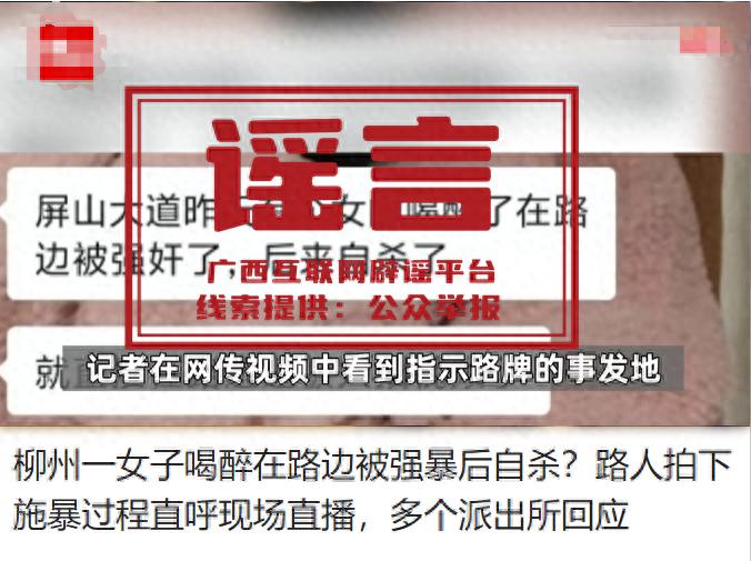 11月5日,有網民在短視頻平臺發佈視頻稱廣西柳州一女子喝醉後在路邊被強暴後自殺,引發網民關注,造成不良影響。