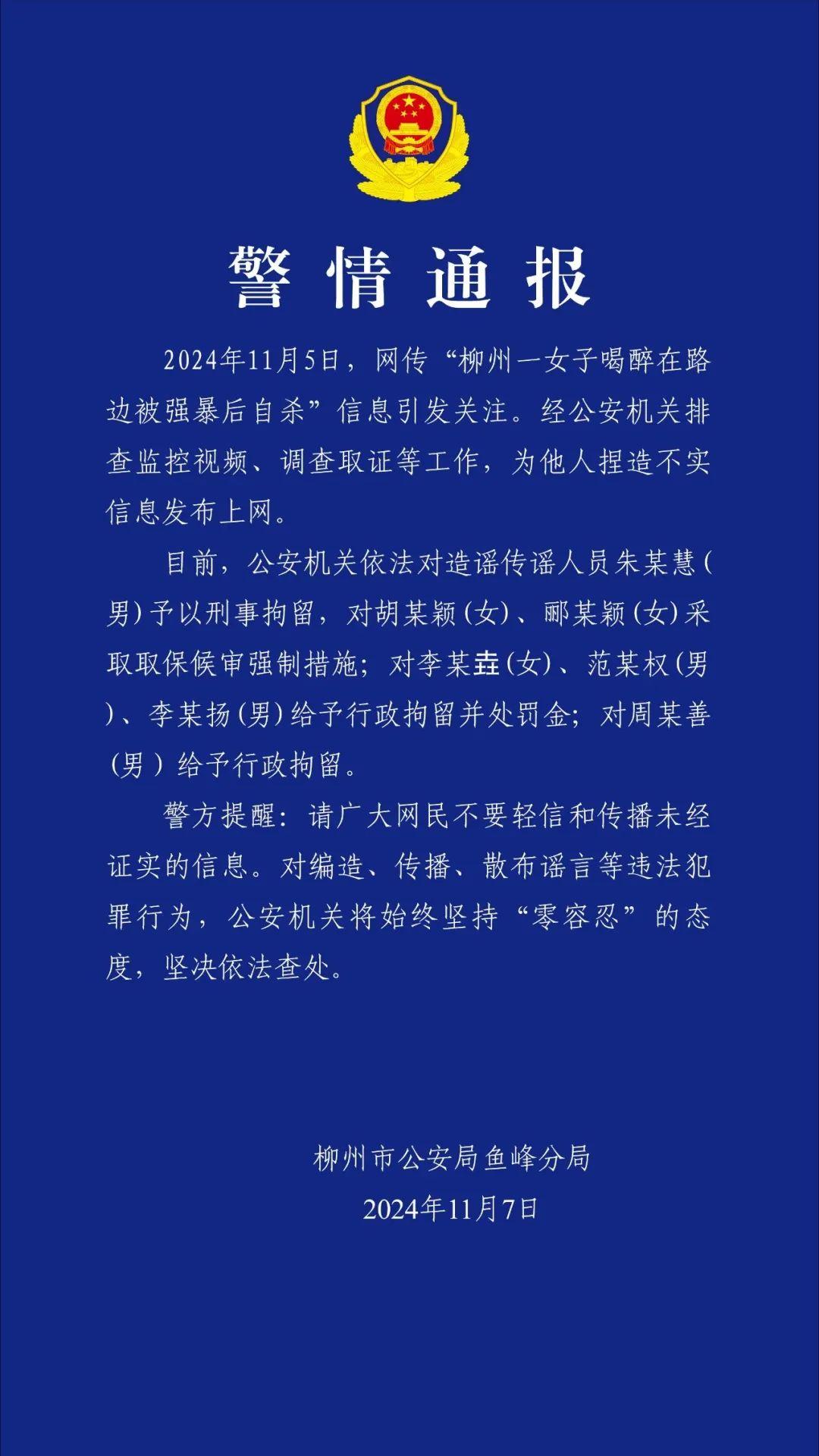 11月7日,柳州市公安局魚峯分局發佈警情通報:依法對造謠傳謠人員朱某慧(男)予以刑事拘留,對胡某穎(女)、酈某穎(女)採取取保候審強制措施;對李某垚(女)、範某權(男)、李某揚(男)給予行政拘留並處罰金;對周某善(男)給予行政拘留。