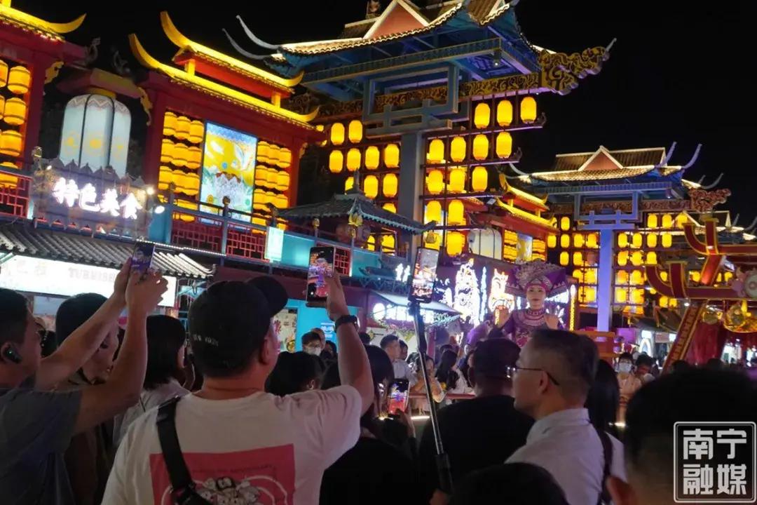 “南寧之夜”不僅匯聚了各地美食,還聚集了廣西少數民族傳統文化、現代文化、智能夜遊、衍生文創、景觀打卡等諸多元素,網絡名人們穿梭其間,既能大飽口福,又能沉浸式感受廣西的文化特色和魅力。