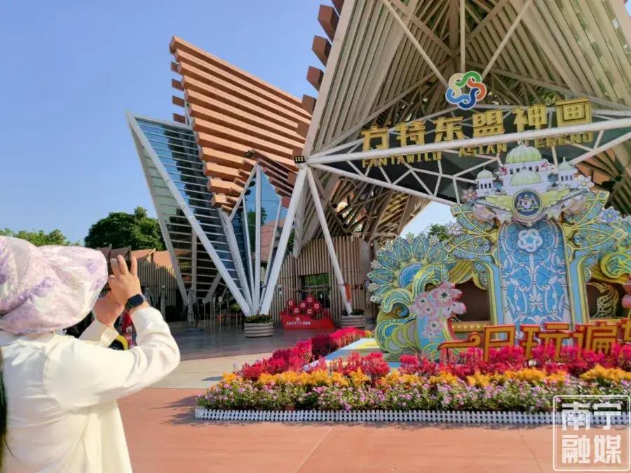 微博博主“fefe喆媽”表示,在這個樂園裏,能看到柬埔寨的壯觀遺蹟吳哥窟、泰國燦爛的皇宮寺廟、新加坡的標誌魚尾獅,走在樂園裏彷彿像出了國。“今年我剛去過老撾,前幾年也去過不少東南亞國家旅行,現在在這裏不用出國也能遊東盟十國,這種沉浸式的體驗真的太奇妙了。”