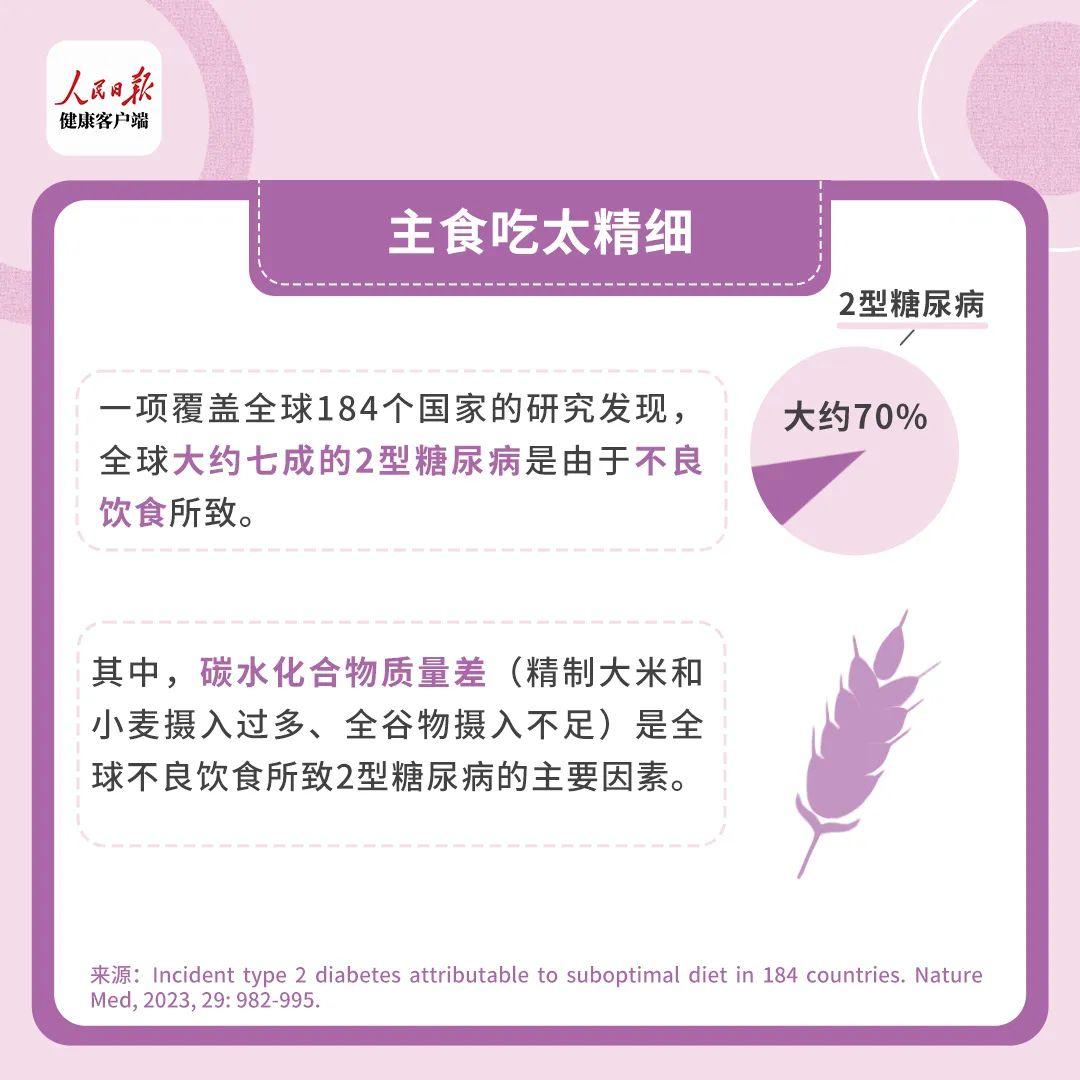一項覆蓋全球184個國家的研究發現,全球大約七成的2型糖尿病是由於不良飲食所致。其中,碳水化合物質量差(精製大米和小麥攝入過多、全穀物攝入不足)是全球不良飲食所致2型糖尿病的主要因素。