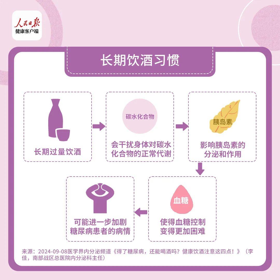 長期過量飲酒會干擾身體對碳水化合物的正常代謝,影響胰島素的分泌和作用。胰島素的分泌可能出現異常,其降血糖的效果也會大打折扣。不僅使得血糖控制變得更加困難,還可能進一步加劇糖尿病患者的病情。