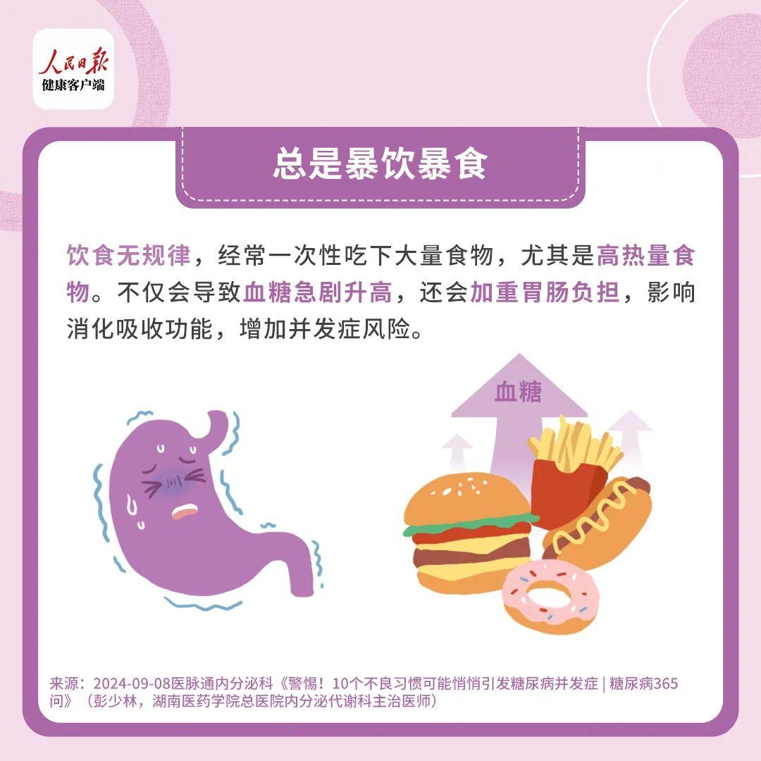 飲食無規律,經常一次性喫下大量食物,尤其是高熱量食物。不僅會導致血糖急劇升高,還會加重胃腸負擔,影響消化吸收功能,增加併發症風險。