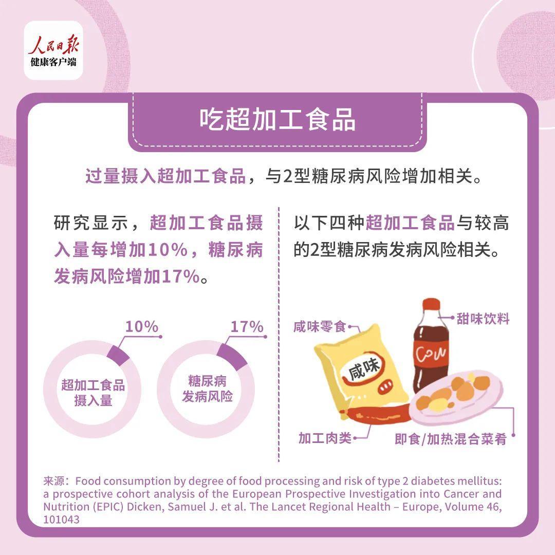 過量攝入超加工食品,與2型糖尿病風險增加相關。研究顯示,超加工食品攝入量每增加10%,糖尿病發病風險增加17%。此外,對不同類型的超加工食品分析發現,鹹味零食、加工肉類、即食/加熱混合菜餚、甜味飲料與較高的2型糖尿病發病風險相關。