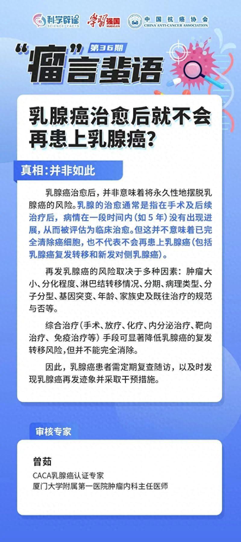 瘤言蜚語|乳腺癌治癒後就不會再患上乳腺癌?