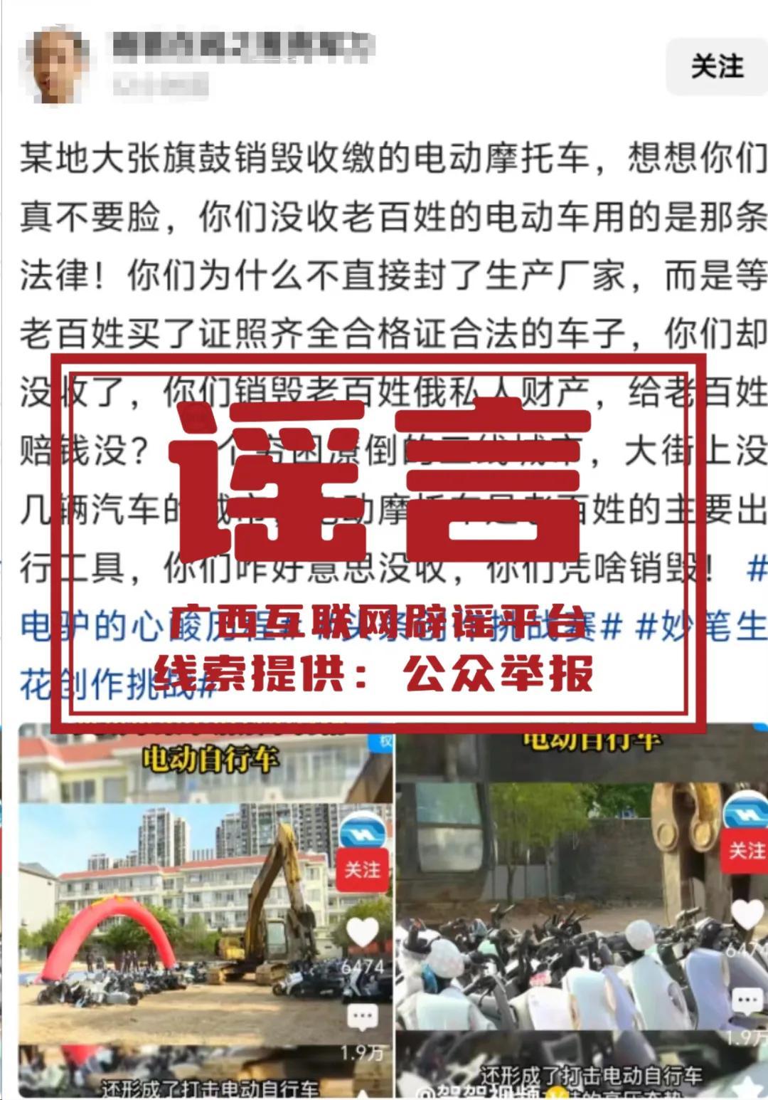 近日,有網民在短視頻平臺發佈“賀州市砸毀市民200多輛摩托車”等標題視頻,誤導網民以爲是市民羣衆的車輛無故被銷燬,引發網民討論。