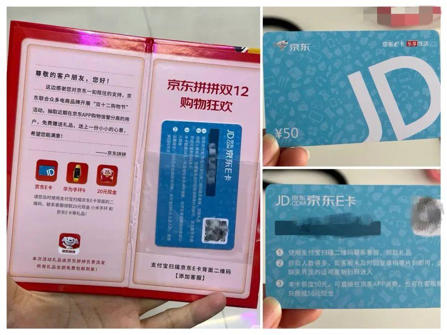 比對發現,市民收到的“京東購物卡”與真正的京東購物卡正面很相似,還列明瞭“50元”或“100元”的金額。