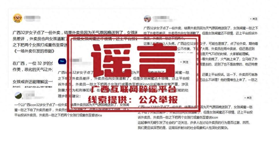 經廣西互聯網闢謠平臺覈實,網傳文章爲不實信息,廣西區內未發生網傳文章所述事件,通過搜索對比發現,類似文章也被冠以其他省份在網上發佈,高度疑似AI生成文章,文章中女子受傷的圖片實際上爲2022年,一網紅遭遇家庭暴力後發佈的實名舉報視頻中的截圖,網傳文章爲移花接木的網絡謠言。此類造謠文章內容上大同小異,有的甚至僅更換了事發地就在網絡平臺發佈,意圖通過製造外賣員與顧客的矛盾博取流量。