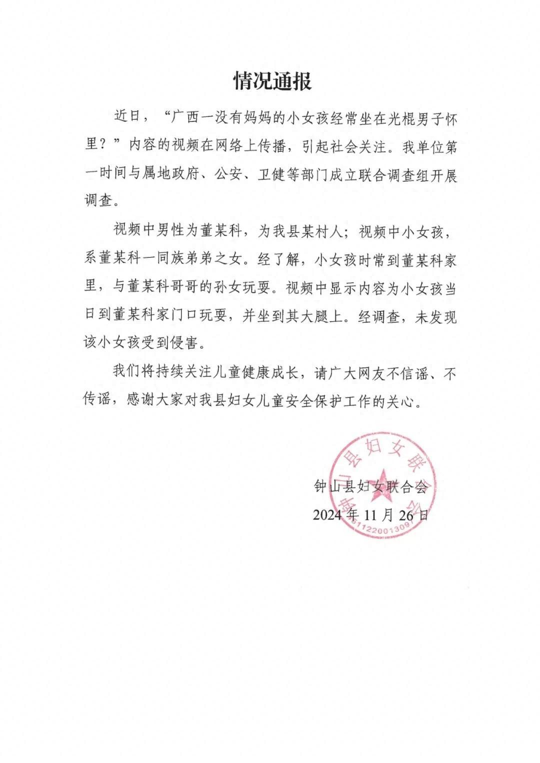 網傳“廣西一沒有媽媽的小女孩經常坐在光棍男子懷裏”?鐘山縣婦聯發佈情況通報