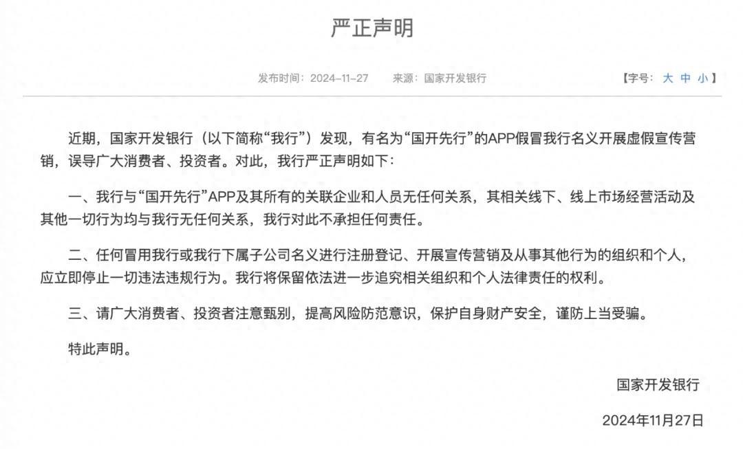 國開行在《聲明》中表示,近期,該行發現,有名爲“國開先行”的App假冒國開行名義開展虛假宣傳營銷,誤導廣大消費者、投資者。對此,國開行嚴正聲明如下: