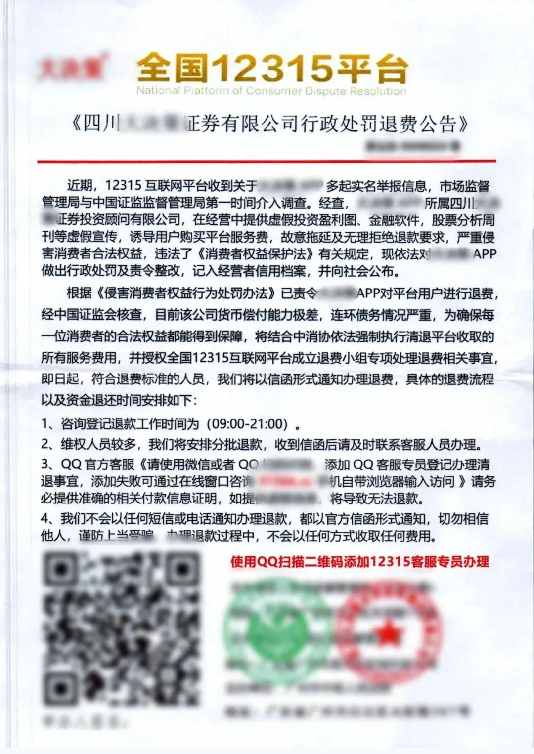 “12315收到多起實名舉報,您之前諮詢的投資顧問公司涉嫌虛假投資盈利,可掃碼申請退款……”成都市金牛區羣衆李先生看到這條信息時大喜過望,隨後按照公告指引,掃碼加入了一個聊天羣。在羣裏接觸到了所謂的高收益投資機會,隨着羣友們紛紛曬出“高收益”截圖,李先生有些坐不住了……
