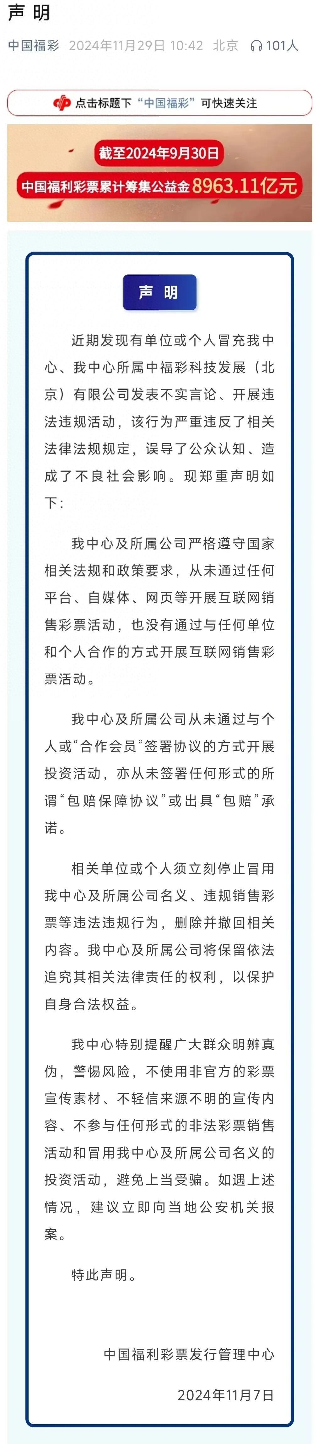 11月29日,“中國福彩”微信公衆號發佈聲明,表示中國福利彩票發行管理中心及所屬中福彩科技發展(北京)有限公司從未通過任何平臺、自媒體、網頁等開展互聯網銷售彩票活動,也沒有通過與任何單位和個人合作的方式開展互聯網銷售彩票活動。聲明如下——